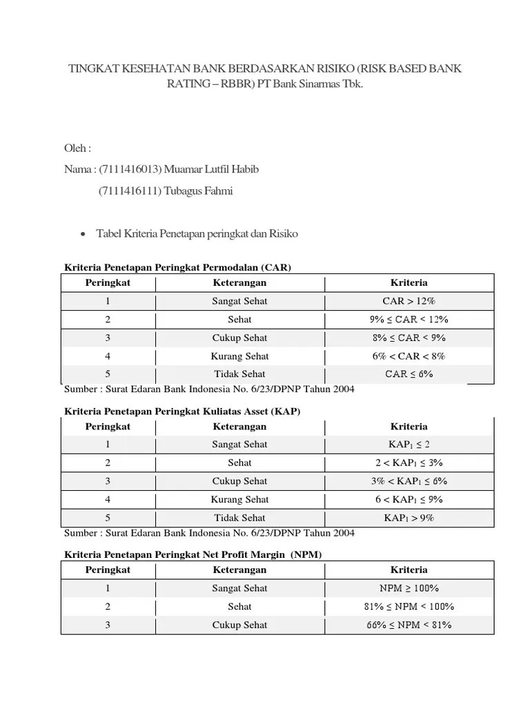 30/05/2004 · surat edaran bank indonesia nomor 6/23/dpnp tahun 2004 tentang sistem penilaian tingkat kesehatan bank umum 6/17/pbi/2004 bank perkreditan rakyat berdasarkan prinsip syariah; Bank indonesia, surat edaran no.6/ 23 /dpnp tanggal 31 mei 2004 tentang sistem penilaian tingkat kesehatan bank umum arikunto, suharsimi. 7 f lampiran 1d surat edaran bank indonesia no.6/ 23./dpnp tanggal 31 mei 2004 matriks perhitungan/analisis komponen faktor rentabilitas (earning) no komponen formula & indikator pendukung keterangan 1 return on asset laba sebelum pajak a. Prosedur penelitian suatu pendekatan praktek. 13/11/2017 · no.6/ 23 /dpnp jakarta, 31 mei 2004 surat edaran kepada semua bank umum yang melaksanakan kegiatan usaha secara konvensional di indonesia perihal: 7/9/pbi/2005 laporan bulanan bank perkreditan rakyat syariah ; 3/30/dpnp tanggal 14 desember 2001 lampiran 14, tentang pedoman perhitungan rasio keuangan. Peraturan bank indonesia no.6/20/pbi/2004 perubahan atas peraturan bank indonesia nomor … Jika benar kamu sudah tepat berada di blog ini. Sistem penilaian tingkat kesehatan bank umum. 6/17/pbi/2004 bank perkreditan rakyat berdasarkan prinsip syariah; Surat edaran bank indonesia no.6/23/dpnp sistem penilaian tingkat kesehatan bank umum dan lampiran;